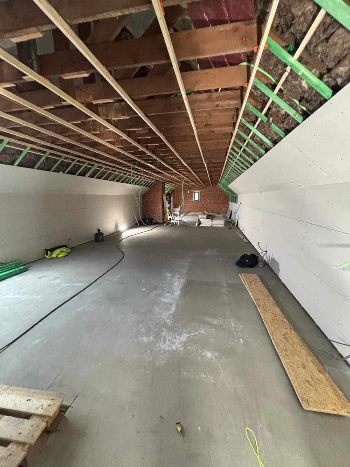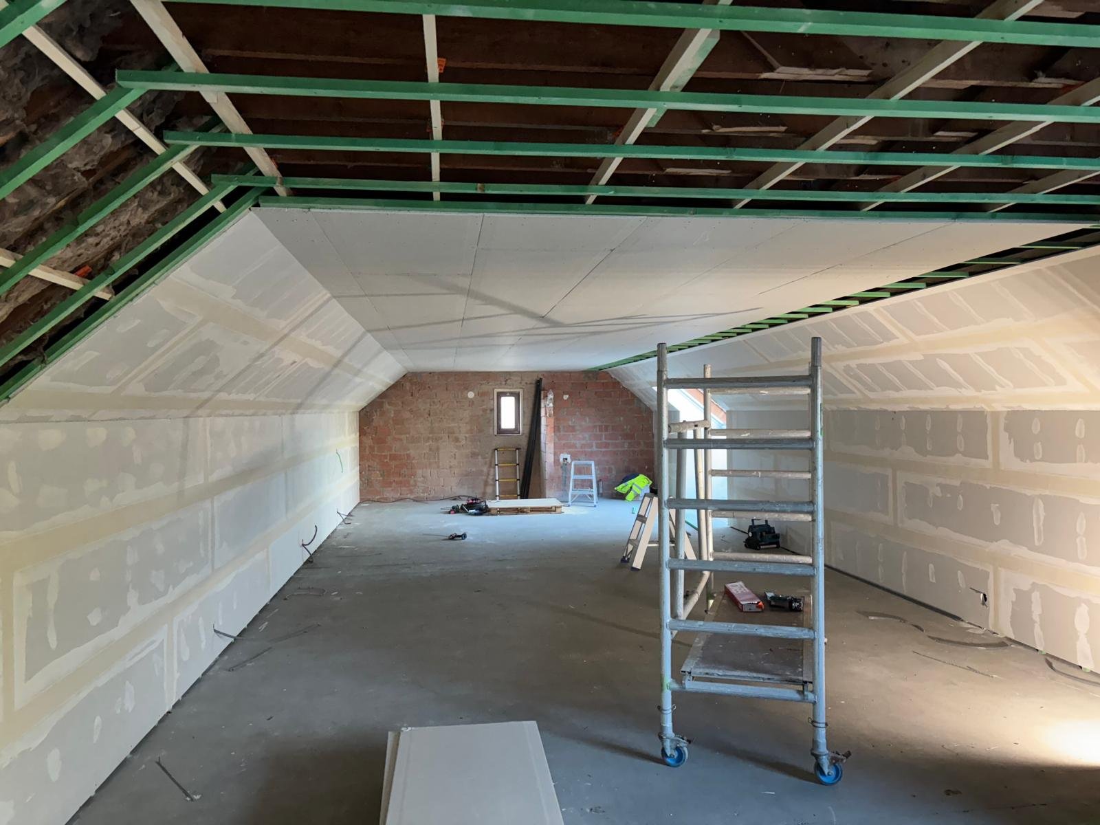 Een goede dakopbouw stopt niet aan de buitenzijde. In dit project werd de zolderruimte stapsgewijs omgevormd tot een afgewerkte binnenruimte. Dankzij de combinatie van dakisolatie en een strakke gyprocafwerking krijgt de ruimte een rustig en uniform karakter, met een duidelijke verbetering van het leefcomfort en de bruikbaarheid onder het dak.